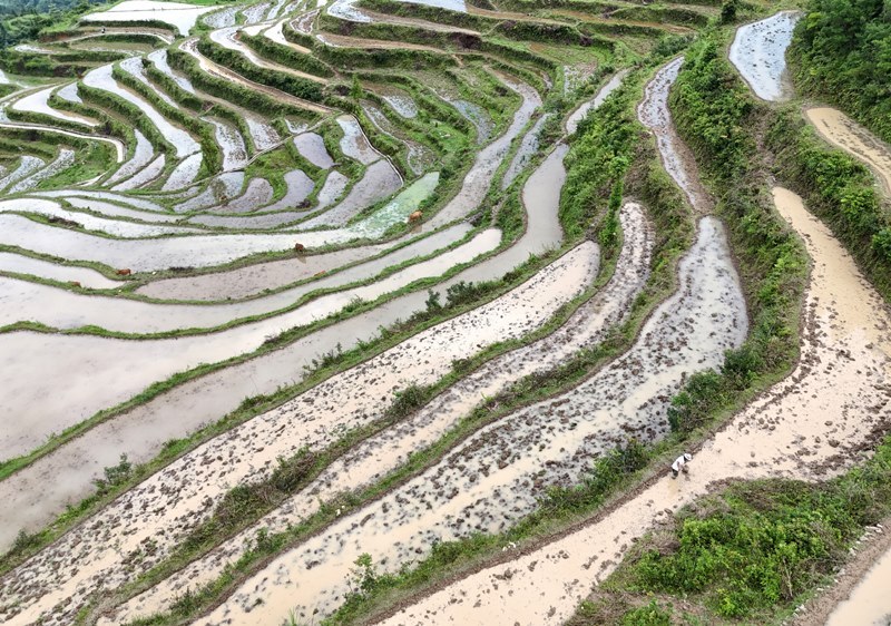 6月14日,在浙江省永嘉縣茗岙鄉(xiāng)梯田,農(nóng)民進(jìn)行水稻插秧準(zhǔn)備工作(無人機(jī)照片)。