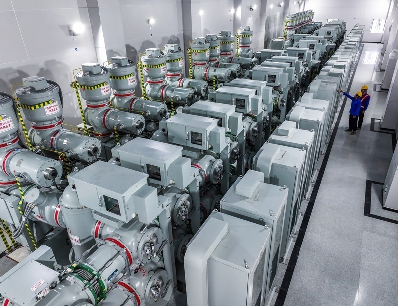 6月24日,在舟山望海(金塘)220千伏輸變電工程的變電站GIS室內(nèi),工作人員進行投運前的巡檢(無人機照片)。