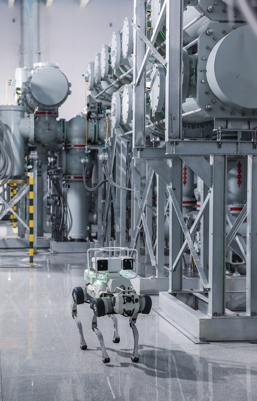 6月24日,機器狗在舟山望海(金塘)220千伏輸變電工程的變電站GIS室內(nèi)巡查。