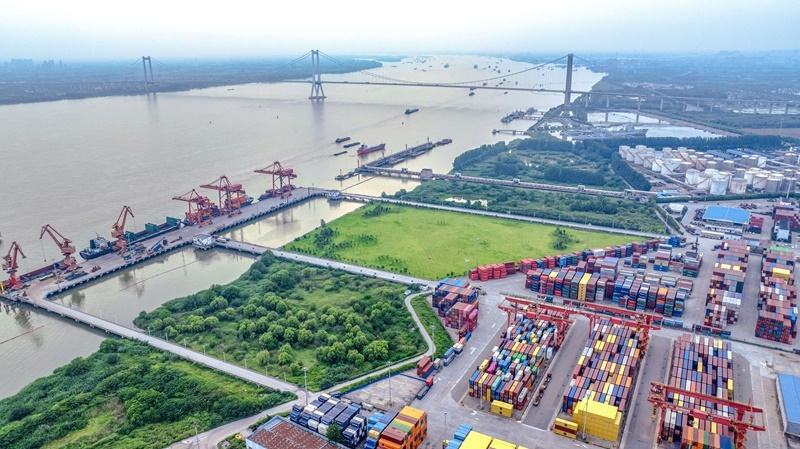 6月29日,在江蘇泰州港集裝箱碼頭,貨船停在泊位裝卸集裝箱(無(wú)人機(jī)照片)。