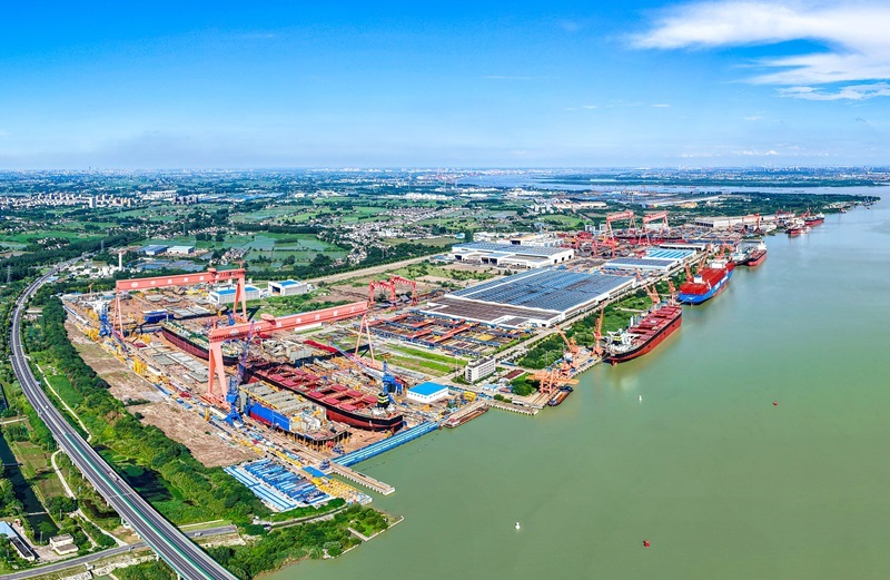 6月28日拍攝的位于江蘇省江都經(jīng)濟(jì)開發(fā)區(qū)的揚(yáng)州中遠(yuǎn)海運(yùn)重工有限公司生產(chǎn)廠區(qū)(無(wú)人機(jī)照片)。