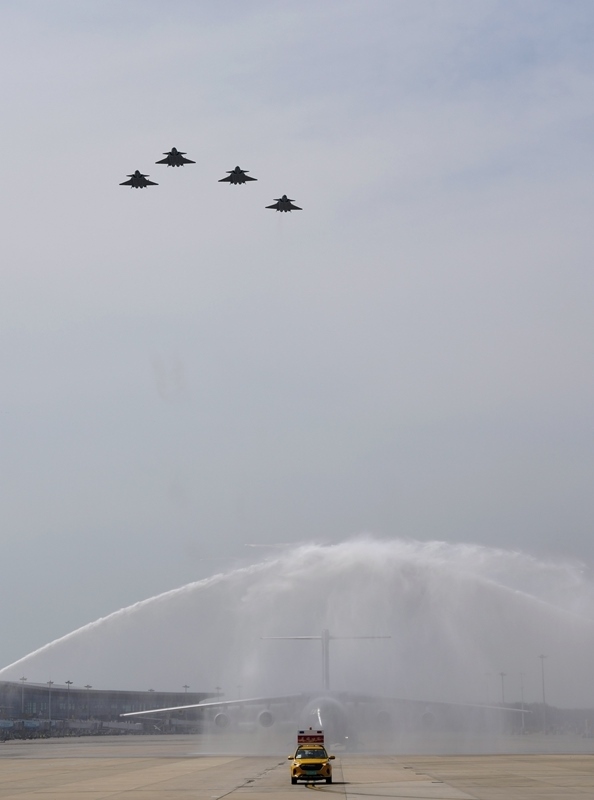9月12日,第十二批在韓中國(guó)人民志愿軍烈士遺骸回國(guó)。這是在沈陽(yáng)桃仙國(guó)際機(jī)場(chǎng),接運(yùn)烈士遺骸回國(guó)的運(yùn)-20專機(jī)通過(guò)水門(mén)。