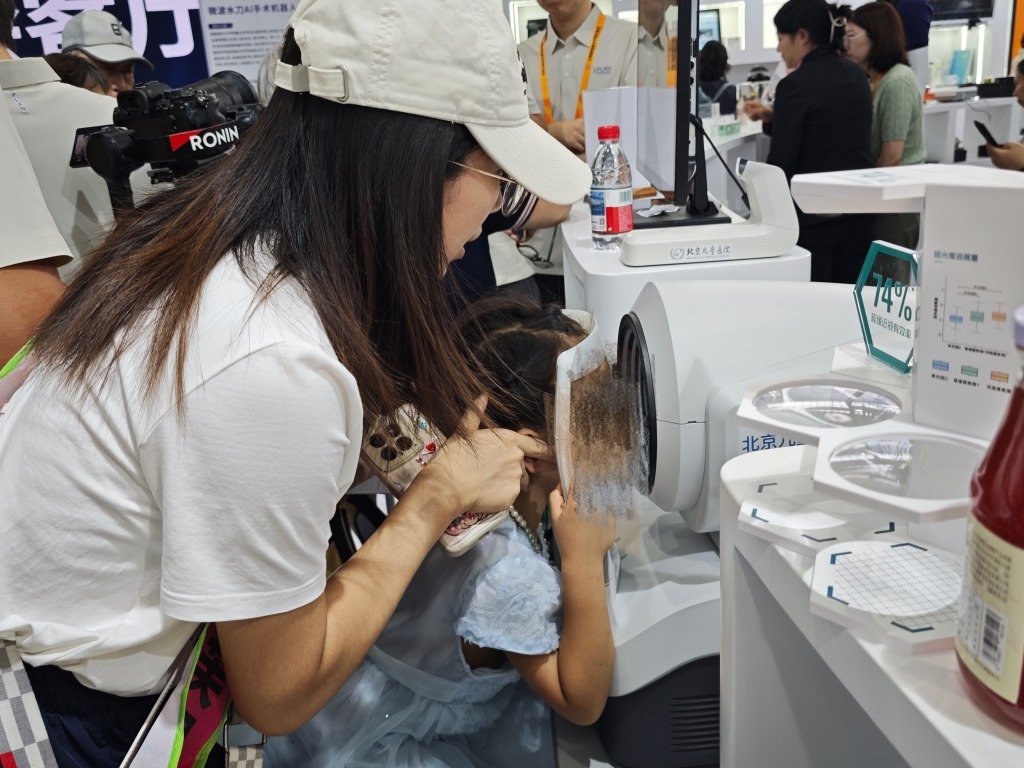 在2025年服貿會健康衛(wèi)生服務專題展,一位工作人員帶著小朋友體驗智能屈光篩查儀。新華社記者 劉禎 攝