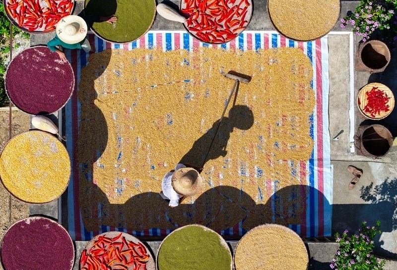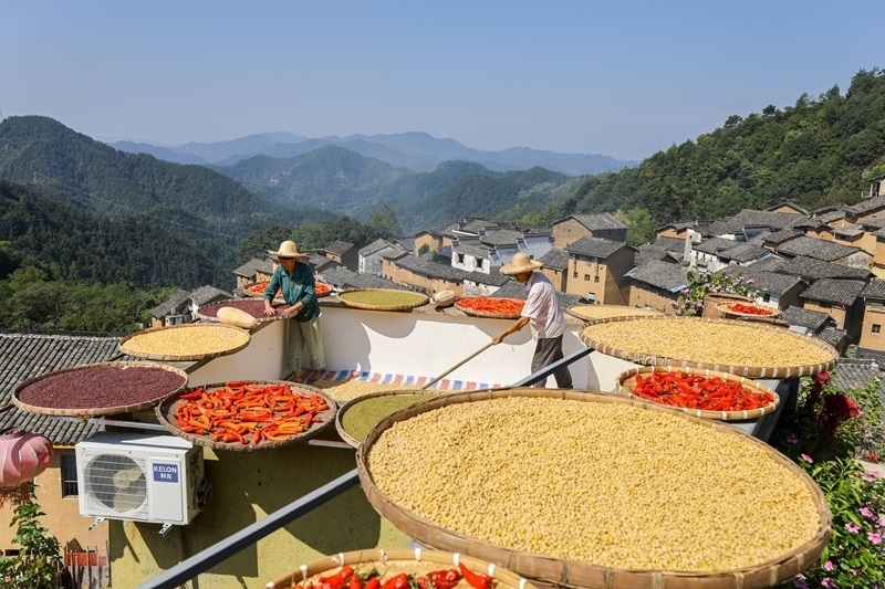 秋收時(shí)節(jié),在安徽省黃山市歙縣深渡鎮(zhèn)陽產(chǎn)村,村民利用晴好天氣,抓緊晾曬收獲的辣椒、玉米、山核桃等農(nóng)作物,描繪出一幅山村“曬秋”圖。