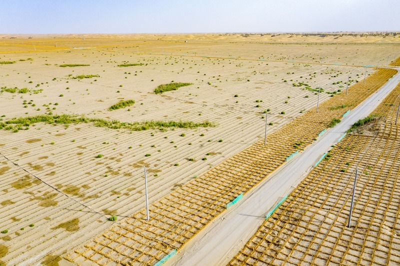 新疆尉犁縣境內(nèi)的塔里木河南岸防沙治沙區(qū)的羅布麻種植區(qū)(左)和固沙草方格(右)(無人機照片,9月20日攝)。