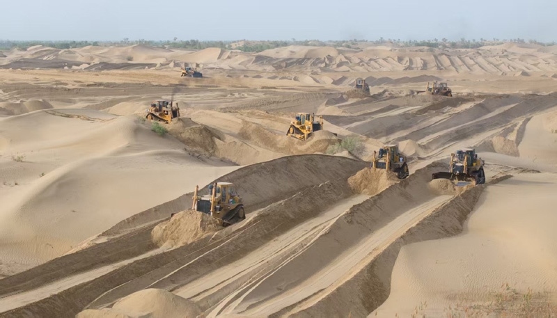 5月22日,在新疆尉犁縣境內(nèi)的塔里木河南岸防沙治沙區(qū),大型機械在平整沙丘(無人機照片)。