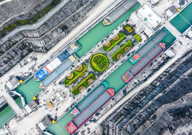 7月1日,在湖北宜昌,船舶有序通過(guò)三峽雙線五級(jí)船閘和升船機(jī)(無(wú)人機(jī)照片)。