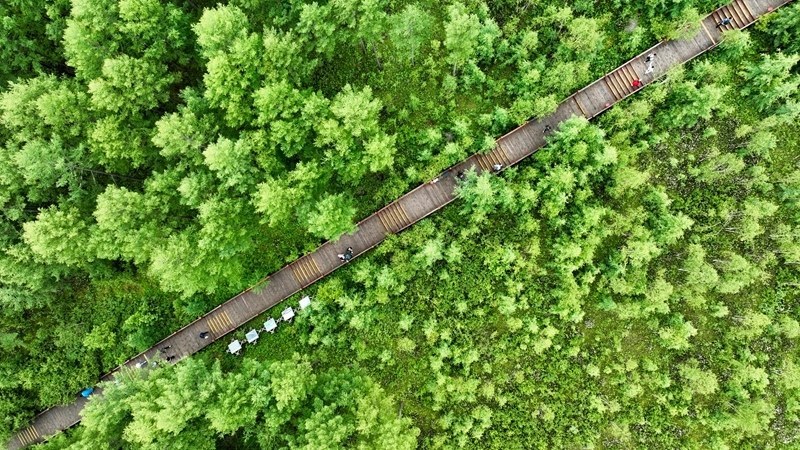 7月5日,游客在內(nèi)蒙古阿爾山國家森林公園游玩(無人機照片)。