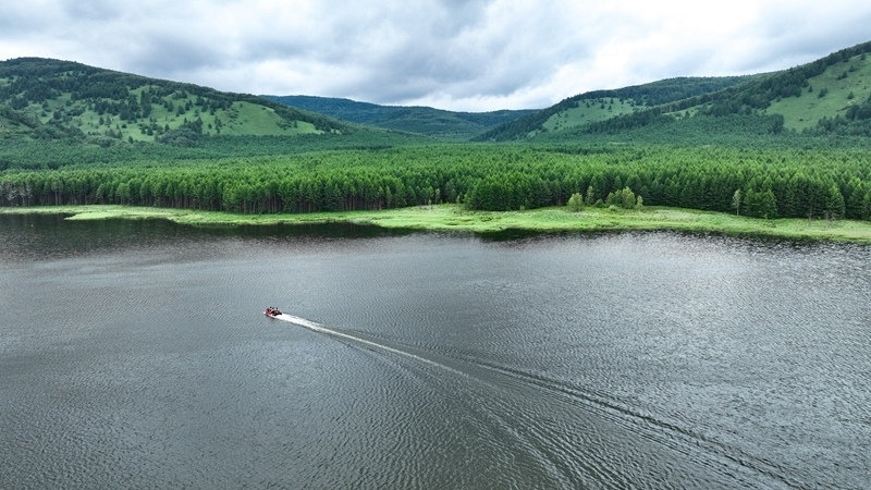 7月5日,游客在內(nèi)蒙古阿爾山國家森林公園烏蘇浪子湖景區(qū)乘船游玩(無人機照片)。