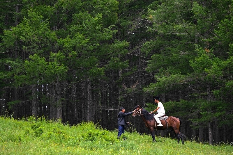 7月5日,游客在內(nèi)蒙古阿爾山國家森林公園體驗騎馬。