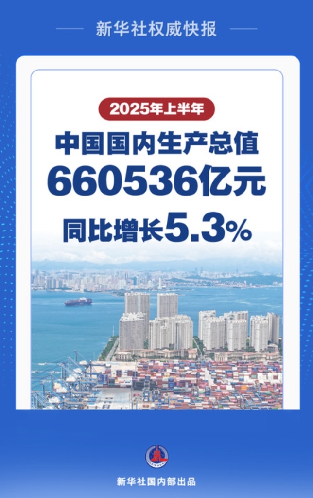 7月15日,國家統(tǒng)計(jì)局發(fā)布數(shù)據(jù)顯示,上半年,中國國內(nèi)生產(chǎn)總值(GDP)660536億元,按不變價(jià)格計(jì)算,同比增長(zhǎng)5.3%。