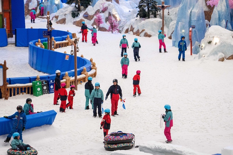 當(dāng)日,湖南長沙發(fā)布當(dāng)?shù)亟衲晔讉€高溫紅色預(yù)警,部分區(qū)域最高氣溫升至40℃以上。位于長沙大王山旅游度假區(qū)的湘江歡樂城歡樂雪域迎來眾多游客。據(jù)了解,這是湖南最大冰雪綜合體之一,深入地下36米打造,溫度常年保持在零下5℃左右,擁有3萬平方米的滑雪與娛雪區(qū)域,能為游客帶來“夏日玩雪”的奇妙體驗。