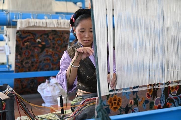 在日喀則市江孜縣的一家藏毯編織車間里,珍拉正盤腿坐在織架前,雙手在密集的經(jīng)線間靈巧地穿梭、挑動(dòng)、打結(jié),一幅寓意吉祥的大鵬金翅鳥(niǎo)圖案,在她手下逐漸成形。