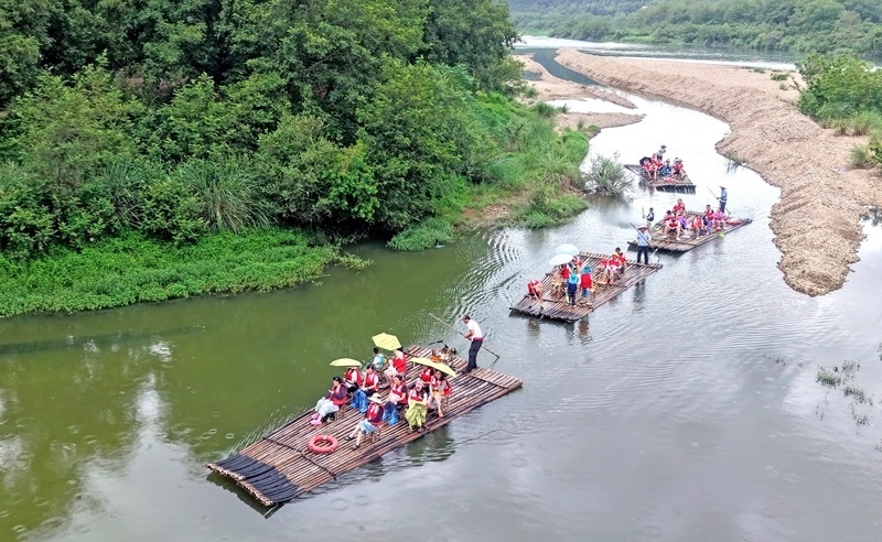 7月25日,游客在浙江省臺(tái)州市仙居縣永安溪乘坐竹筏漂流(無(wú)人機(jī)照片)。