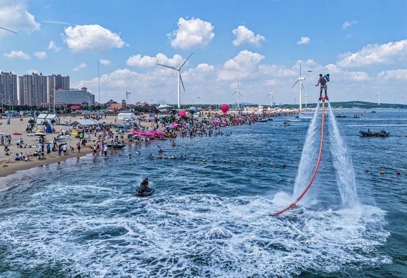 7月24日,游客在山東省榮成市那香海國(guó)際旅游度假區(qū)體驗(yàn)“水上飛人”(無(wú)人機(jī)照片)。