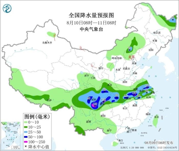 8月10日08時(shí)至11日08時(shí),陜西南部、河南南部、四川大部、重慶大部、湖北大部、安徽中南部、江蘇中南部、上海、浙江北部以及內(nèi)蒙古東南部、黑龍江東北部等地部分地區(qū)有中到大雨,其中,安徽西南部、江蘇中南部、湖北東部和西南部、四川盆地中東部和西南部、重慶中西部和東北部、云南東北部等地部分地區(qū)有暴雨或大暴雨(100~150毫米)。內(nèi)蒙古西北部、新疆沿天山地區(qū)等地部分地區(qū)有4~5級(jí)風(fēng)。東海北部海域?qū)⒂?~7級(jí)風(fēng)、陣風(fēng)8級(jí),黃海南部海域、東海南部海域?qū)⒂?~6級(jí)風(fēng)、陣風(fēng)7級(jí)。