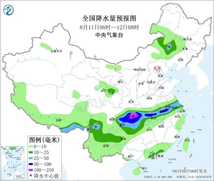 8月11日08時(shí)至12日08時(shí),內(nèi)蒙古東南部、四川盆地東部、重慶、貴州北部和西部、湖北中西部和東北部、安徽中部、江蘇中南部以及廣東中南部、云南北部、西藏東南部等地部分地區(qū)有中到大雨,其中,安徽中部、湖北西南部、四川盆地東北部、重慶中西部和東北部等地部分地區(qū)有暴雨或大暴雨(100~150毫米)。內(nèi)蒙古西北部部分地區(qū)有4~6級(jí)風(fēng),其中,新疆東部部分地區(qū)有6~7級(jí)風(fēng)。東海大部海域、南海西南部海域?qū)⒂?~6級(jí)風(fēng)、陣風(fēng)7級(jí)。