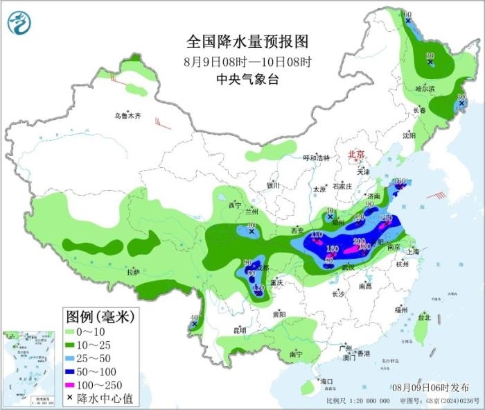 8月9日08時(shí)至10日08時(shí),青海東南部、甘肅南部、川西高原北部、陜西南部、河南大部、山東東部和南部、湖北大部、安徽中北部、江蘇中北部、四川盆地西部和南部以及黑龍江中北部、吉林東部、西藏東南部等地部分地區(qū)有中到大雨,其中,陜西南部、山東東部和南部、河南東北部和中南部、安徽中北部、江蘇北部、湖北北部、四川盆地西部和南部等地部分地區(qū)有暴雨或大暴雨(100~200毫米)。新疆北疆北部和東部、山東半島等地部分地區(qū)有4~5級(jí)風(fēng)。黃海中部海域?qū)⒂?~7級(jí)風(fēng)、陣風(fēng)8級(jí),黃海南部海域、東海北部海域?qū)⒂?~7級(jí)風(fēng)、陣風(fēng)8級(jí),渤海、東海南部海域?qū)⒂?~6級(jí)風(fēng)、陣風(fēng)7級(jí)。