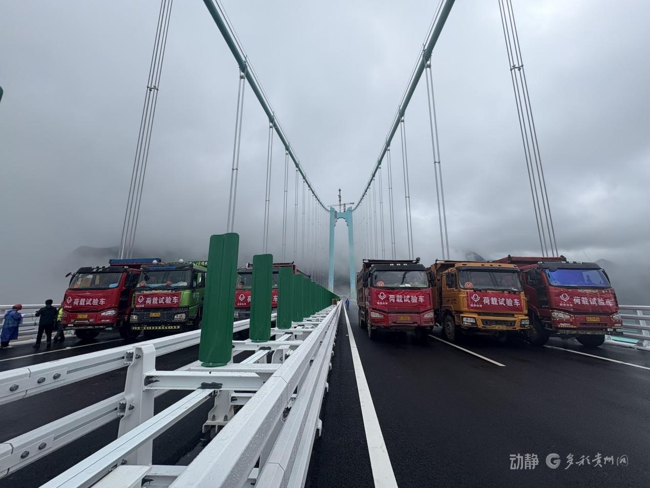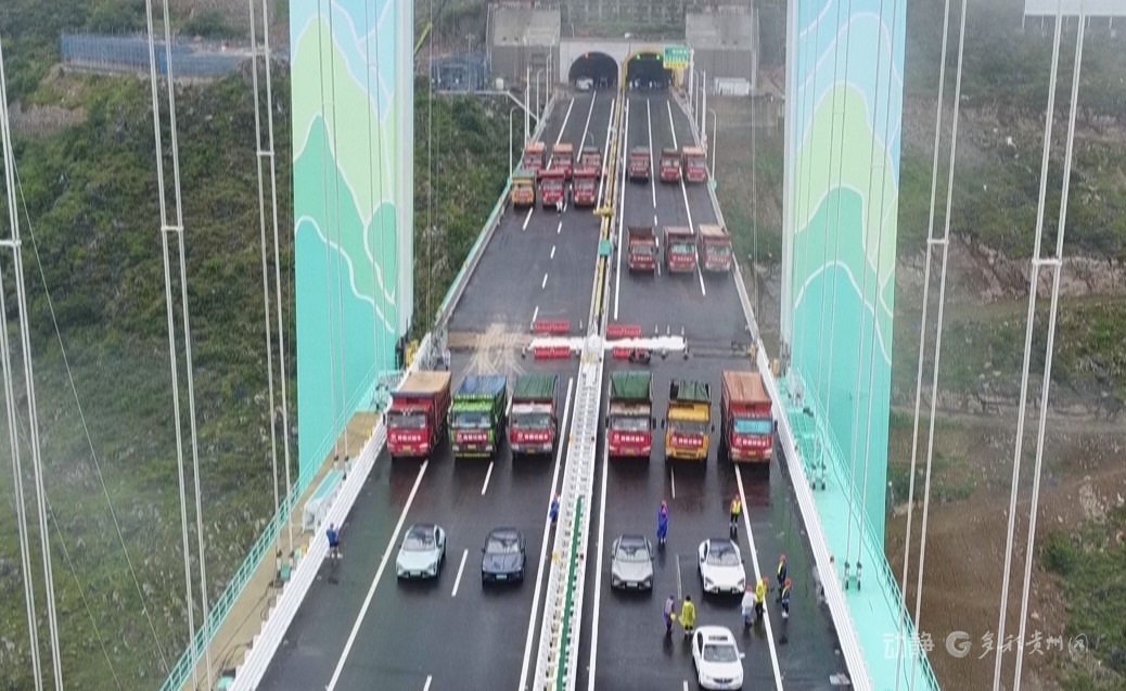 花江峽谷大橋啟動(dòng)荷載試驗(yàn)8月21日,隨著6輛35噸的三軸載重車率先駛上橋面,花江峽谷大橋荷載試驗(yàn)正式啟動(dòng),迎來通車前的“關(guān)鍵大考”。