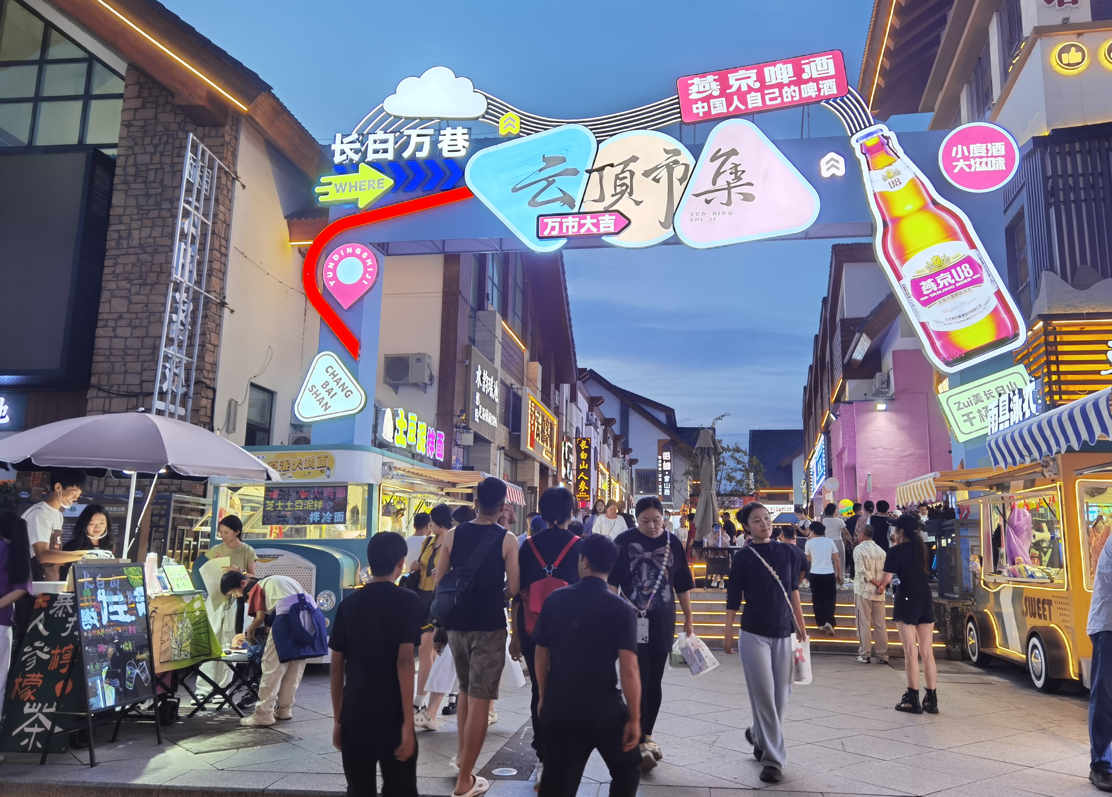 夜幕初降,云頂市集人潮涌動,樂隊彈唱與林間松風(fēng)交織;雪絨花音樂生活館里,燈光璀璨,民謠悠遠(yuǎn);美人松愛情森林里,漫步其間的情侶與家庭,寫下屬于他們的浪漫記憶。更令人驚艷的,是今夏盛大開街的恩都里(滿語enduri意為“神靈”)休閑度假商旅社區(qū)。