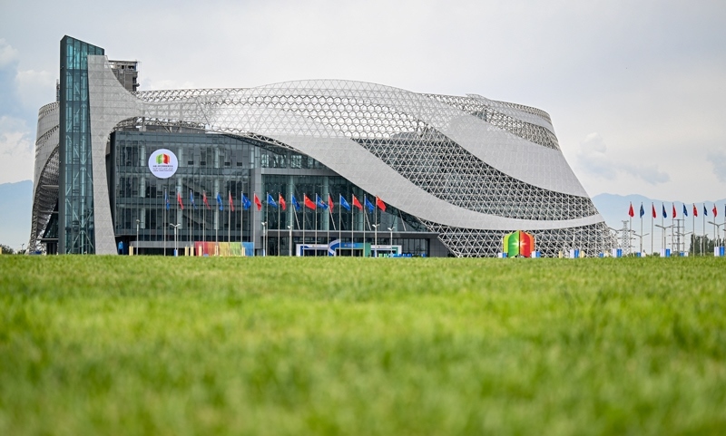 這是8月28日在寧夏銀川市拍攝的第七屆中國—阿拉伯國家博覽會開幕式舉辦地——寧夏國際會堂外景。