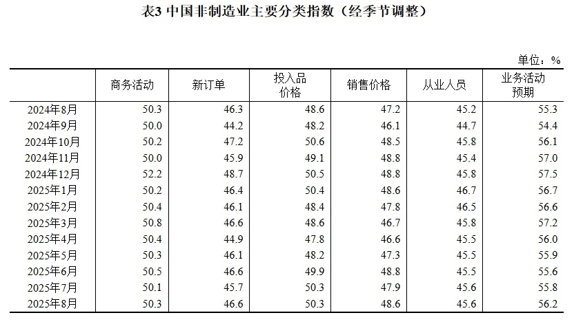 8月份,非制造業(yè)商務(wù)活動(dòng)指數(shù)為50.3%,比上月上升0.2個(gè)百分點(diǎn),高于臨界點(diǎn),非制造業(yè)繼續(xù)保持?jǐn)U張。