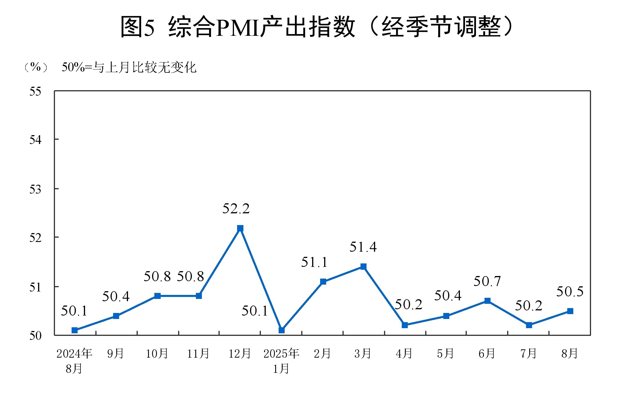 8月份,綜合PMI產(chǎn)出指數(shù)為50.5%,比上月上升0.3個(gè)百分點(diǎn),持續(xù)高于臨界點(diǎn),表明我國(guó)企業(yè)生產(chǎn)經(jīng)營(yíng)活動(dòng)總體擴(kuò)張有所加快。