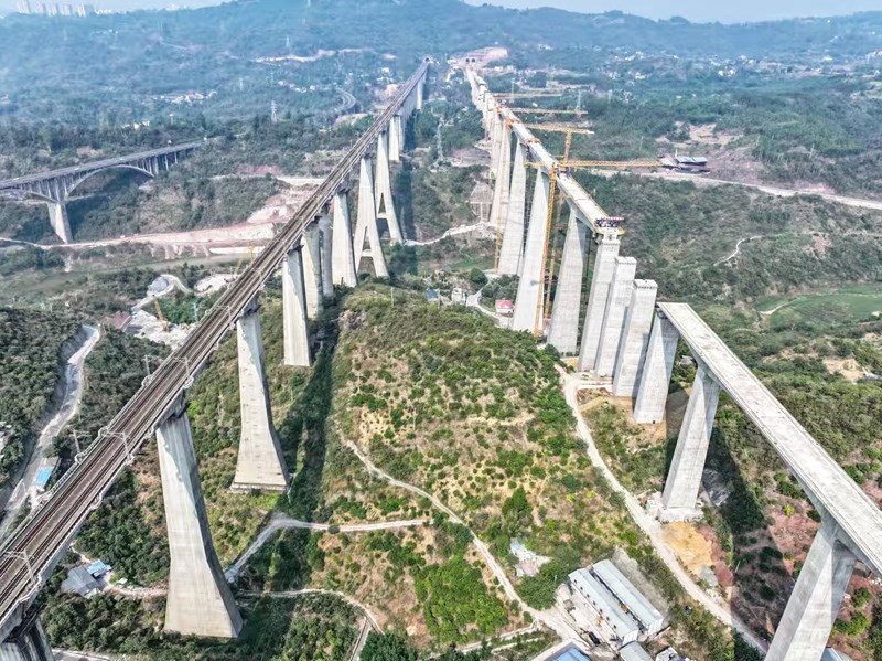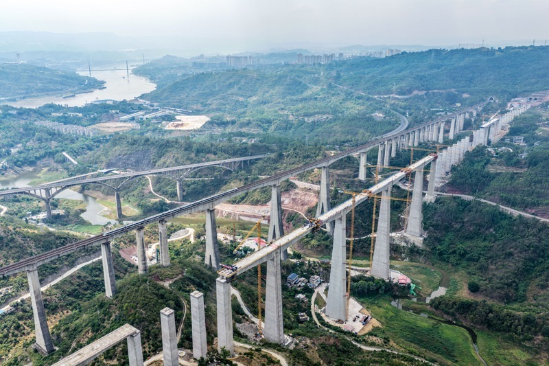 蔡家溝雙線特大橋位于重慶市涪陵區(qū),橫跨長江支流,是全線重難點(diǎn)工程。大橋主跨采用連續(xù)剛構(gòu)設(shè)計(jì),整體呈“兩端短、中間長”的對(duì)稱結(jié)構(gòu),總跨度達(dá)584米。