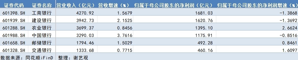 具體來看,農(nóng)業(yè)銀行、交通銀行、郵儲(chǔ)銀行實(shí)現(xiàn)營(yíng)收和凈利潤(rùn)指標(biāo)雙增,但工商銀行、建設(shè)銀行、中國(guó)銀行歸屬于母公司股東的凈利潤(rùn)同比有所下降,降幅分別為1.39%、1.37%和0.85%。