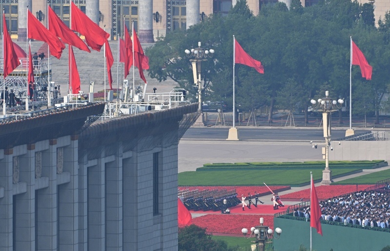9月3日,紀(jì)念中國(guó)人民抗日戰(zhàn)爭(zhēng)暨世界反法西斯戰(zhàn)爭(zhēng)勝利80周年大會(huì)在北京隆重舉行。這是天安門(mén)廣場(chǎng)舉行隆重的升國(guó)旗儀式。