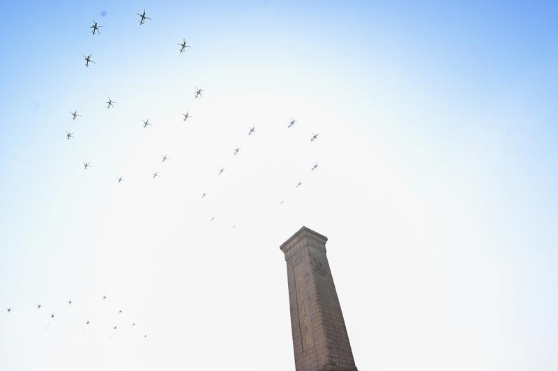 9月3日,紀念中國人民抗日戰(zhàn)爭暨世界反法西斯戰(zhàn)爭勝利80周年大會在北京隆重舉行。這是空中護旗梯隊飛過天安門廣場上空,26架直升機匯成巨大的“80”字樣。
