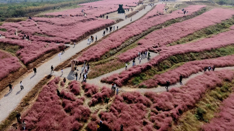 10月18日,游客在山東省臨沂市平邑縣柏林鎮(zhèn)粉黛亂子草花田游玩(無(wú)人機(jī)照片)。