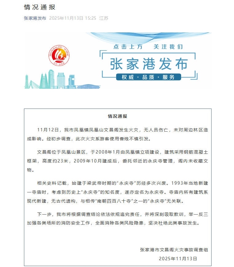 官方通報(bào)張家港鳳凰山文昌閣火災(zāi):系游客使用香燭不慎引發(fā)