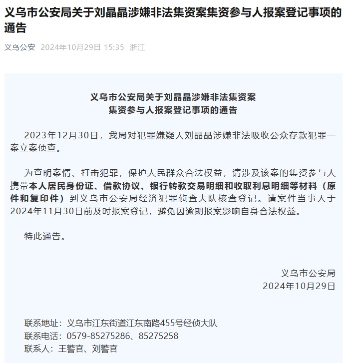 此前義烏公安也有在通告中公布嫌疑人全名的情況,例如2024年12月30日,其曾發(fā)布“關于劉晶晶涉嫌非法集資案集資參與人報案登記事項的通告”,亦是非法集資案,同樣公布嫌疑人全名。