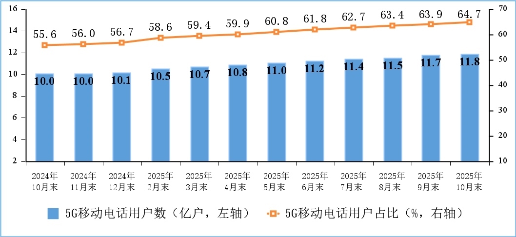 移動(dòng)電話用戶規(guī)模穩(wěn)中有增,5G用戶數(shù)持續(xù)增加。截至10月末,三家基礎(chǔ)電信企業(yè)及中國廣電的移動(dòng)電話用戶總數(shù)達(dá)18.3億戶,比上年末凈增4015萬戶。其中,5G移動(dòng)電話用戶達(dá)11.84億戶,比上年末凈增1.7億戶,占移動(dòng)電話用戶的64.7%。