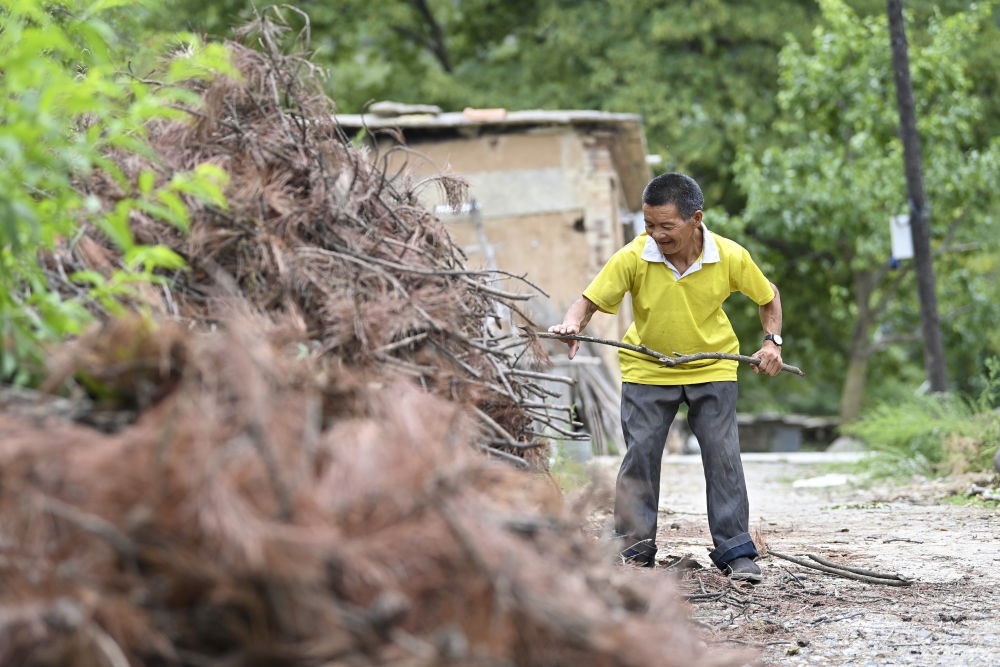 ↑秦海松為村民元有才整理柴火(2025年8月6日攝)。