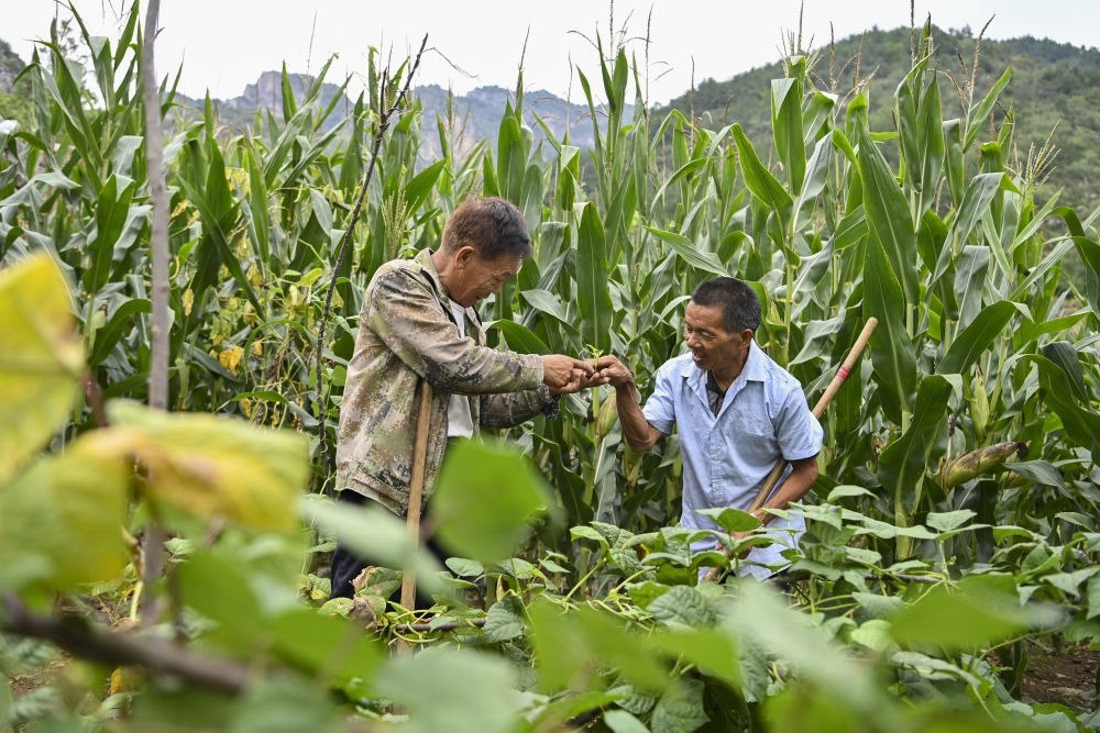 ↑村民桑建平(左)通過手勢告訴秦海松野草和蔬菜的區(qū)別(2025年8月27日攝)。