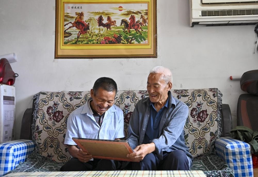 ↑桑春玉(右)向秦海松展示家里的老照片(2025年8月27日攝)。