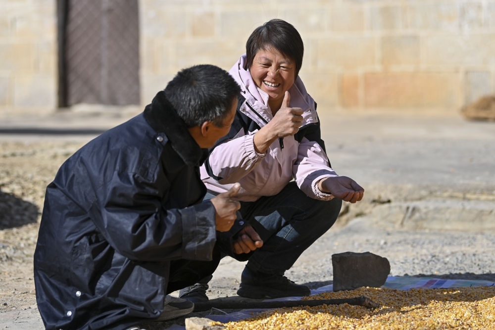 ↑村民程嬌梅(右)向幫忙撿玉米的秦海松表達(dá)感謝(2025年12月1日攝)。