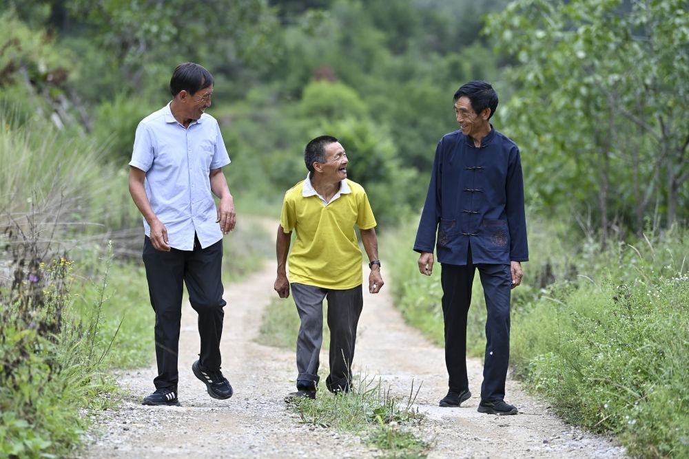 ↑村干部申廣軍(左)、村民桑建國(右)送秦海松到照顧他的下一戶村民家(2025年8月6日攝)。