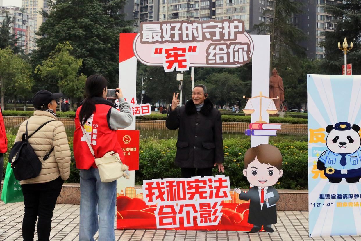 12月4日,四川省樂山市市中區(qū)司法局普法宣傳志愿者在樂山新廣場開展“憲法宣傳日”活動,市民在法治打卡框合影留念。(工人日報(bào)通訊員 李華時 攝)