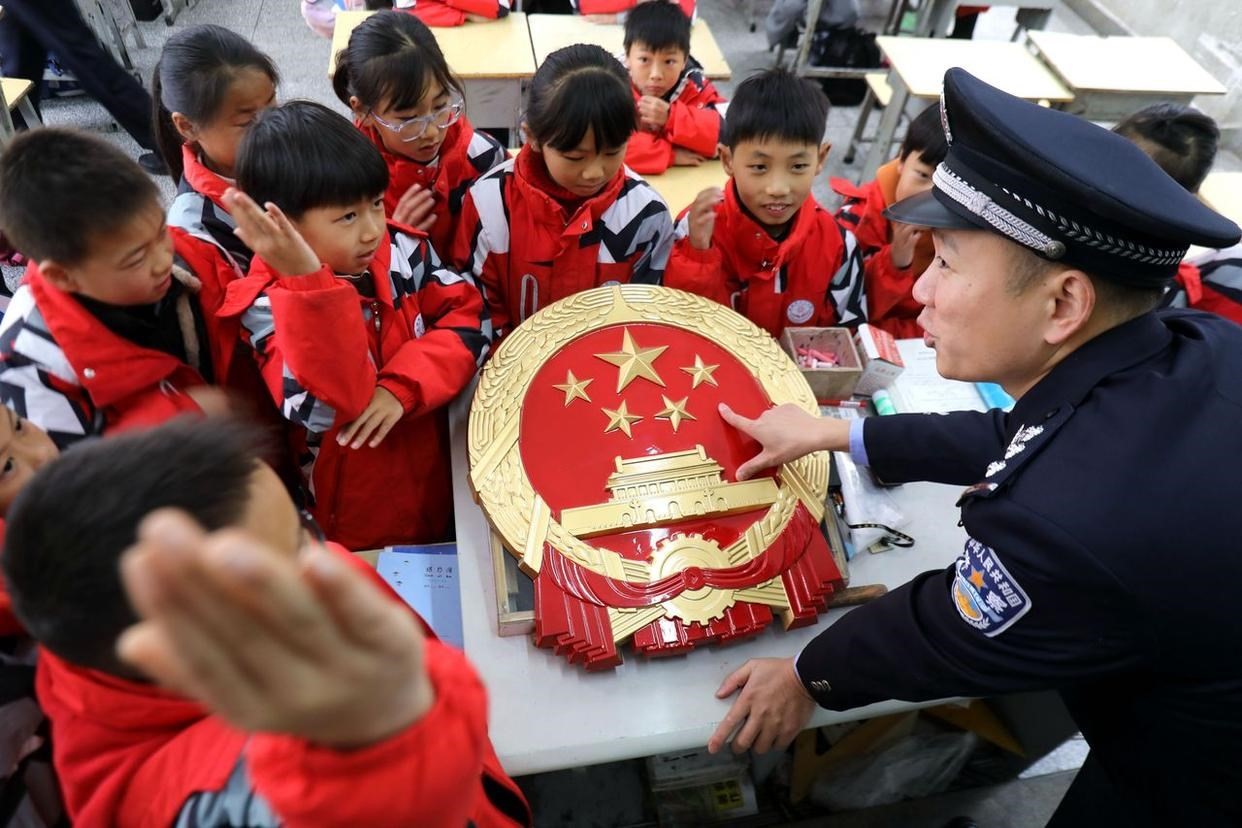 12月4日,民警在江蘇省泰州市海陵區(qū)九龍實(shí)驗(yàn)學(xué)校給學(xué)生講解憲法知識。當(dāng)?shù)?,通過咨詢、普法課堂等多種形式開展憲法宣傳教育活動,弘揚(yáng)憲法精神,提升公民法治素養(yǎng)。(工人日報(bào)通訊員 湯德宏 攝)
