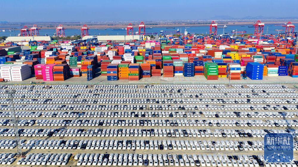 ↑ 12月14日在江蘇省港口集團南京港龍?zhí)都b箱碼頭拍攝的等待裝船出口的國產(chǎn)汽車(無人機照片)。新華社發(fā)(楊素平攝)