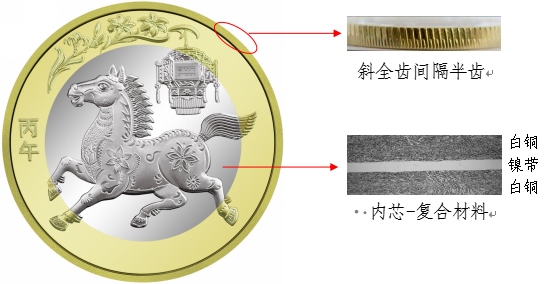 硬幣外環(huán)為黃銅合金,內(nèi)芯為具有獨特機讀性能的鎳帶復(fù)合白銅材料。防偽特征效果見圖1。