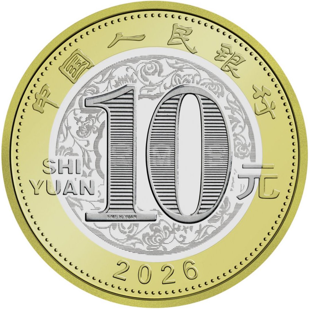 雙色銅合金紀(jì)念幣正面圖案為“中國人民銀行”、“10元”字樣,漢語拼音字母“SHIYUAN”及年號“2026”,底紋襯以團花圖案。