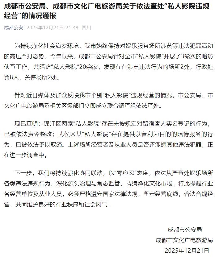 據(jù)“成都公安”微信公眾號消息,12月21日晚,成都市公安局、成都市文化廣電旅游局發(fā)布關于依法查處“私人影院違規(guī)經(jīng)營”的情況通報:今年以來,成都市公安局針對全市“私人影院”開展了3輪次的暗訪偵查工作,共暗訪“私人影院”20余家,發(fā)現(xiàn)存在涉黃違法行為的場所2處,行政處罰8人,關停場所2處。