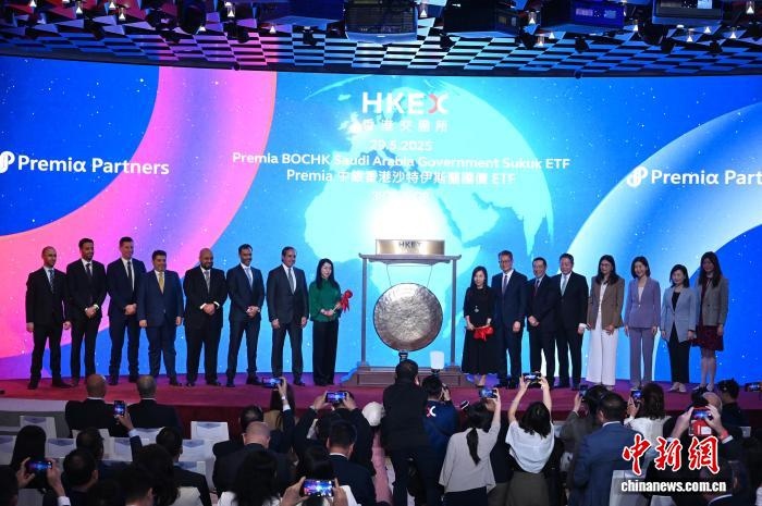 2025年5月29日,香港交易及結(jié)算所有限公司與沙特阿拉伯證券交易所集團(tuán)在香港合辦“香港——沙特資本市場(chǎng)論壇”?,F(xiàn)場(chǎng)亦舉行Premia中銀香港沙特伊斯蘭國(guó)債交易所買(mǎi)賣(mài)基金(ETF)在香港上市的敲鑼儀式。圖為香港特區(qū)政府財(cái)政司司長(zhǎng)陳茂波(右七)等嘉賓出席敲鑼儀式。 中新社記者 李志華 攝