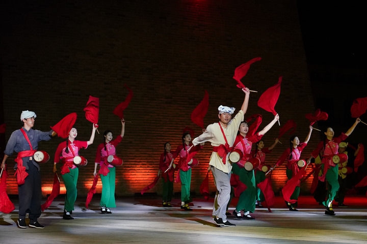 2025年7月29日,演員在位于陜西延安的金延安文化旅游產業(yè)園區(qū)表演紅色歌舞劇《延安十三年》。新華社記者 樊雨晴 攝