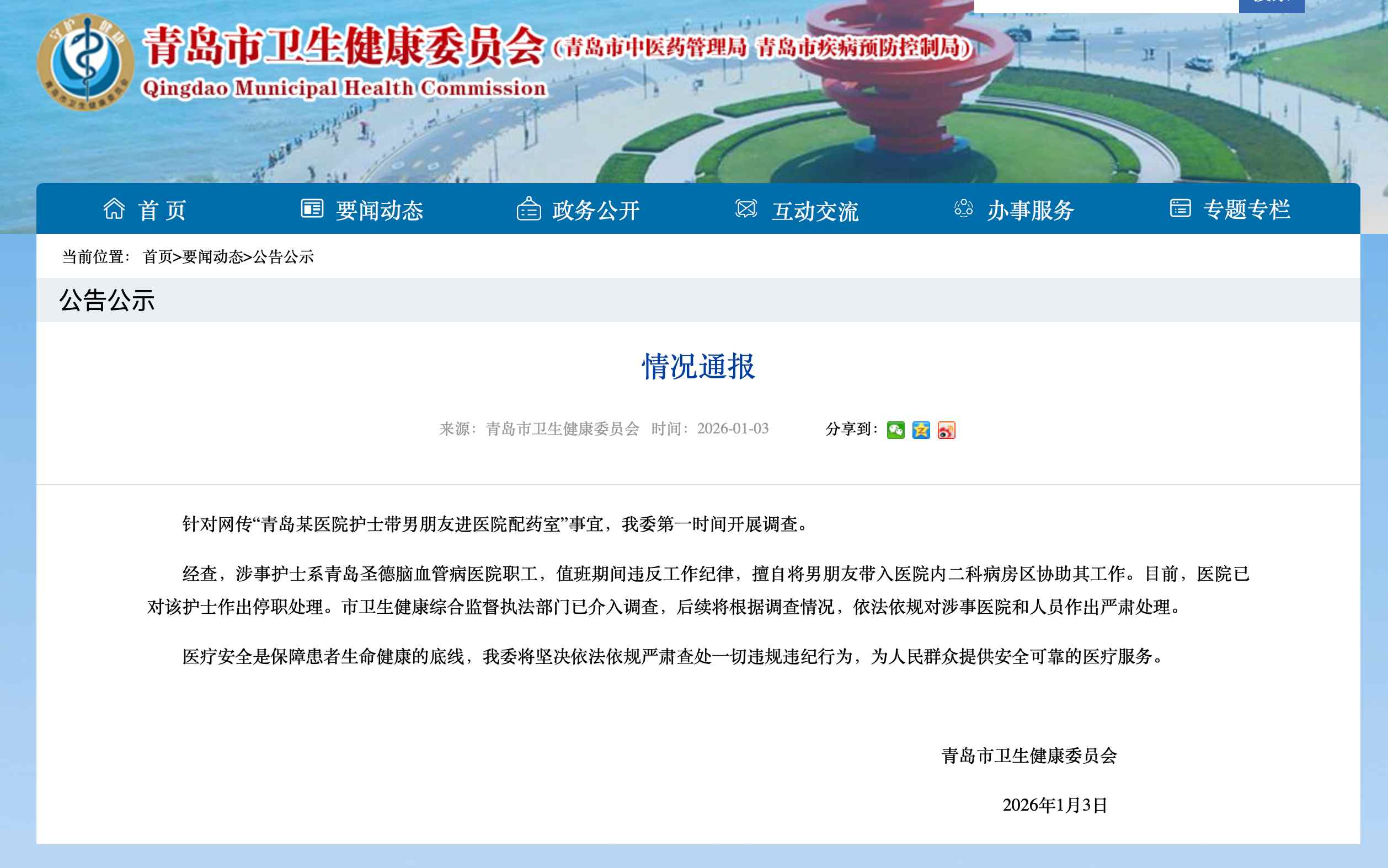 中國網(wǎng)1月3日訊 1月3日,青島市衛(wèi)生健康委員會(huì)發(fā)布情況通報(bào):針對(duì)網(wǎng)傳“青島某醫(yī)院護(hù)士帶男朋友進(jìn)醫(yī)院配藥室”事宜,青島市衛(wèi)生健康委第一時(shí)間開展調(diào)查。