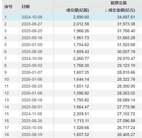 據(jù)Wind統(tǒng)計(jì),A股成交額突破3萬億元此前總共發(fā)生了6次,分別是2024年10月8日,2025年8月25日、8月27日、8月28日和9月18日,2026年1月9日。